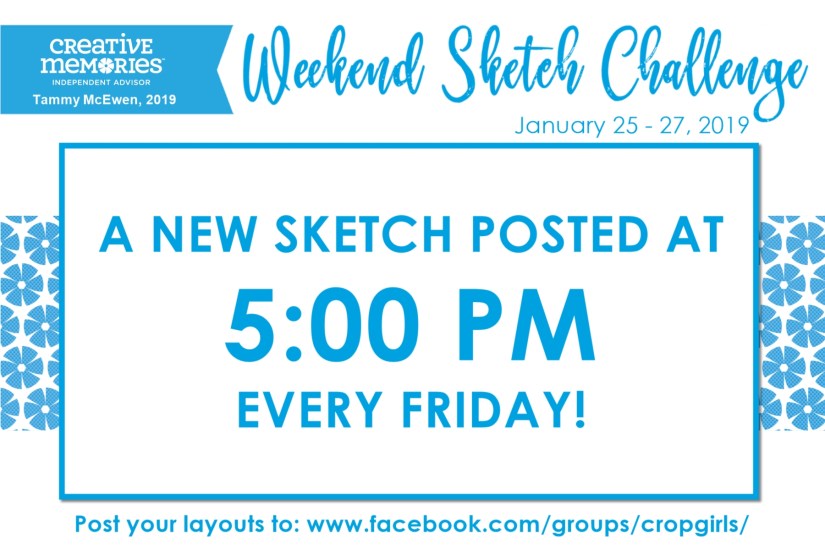 Each Friday at… you guessed it… 5 PM, on our Crop Girls Facebook Group, I’ll post a two-page sketch that I’ve scoured the internet for and think you would like. You can then create that layout and share it with us in the comment section of that post! No time that weekend? The post isn’t going anywhere – you can create it anytime you like, just be sure to “like” the post when you see it so you can find it! Be sure to visit our Crop Girls Facebook Group for Friday’s post!