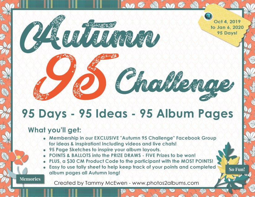 Are you looking for scrapbooking ideas & inspiration to help keep you motivated to get your photos into albums this autumn? Are you looking for new techniques or a reminder of ones you may have forgotten? Are you looking for a way tackle that backlog of photos and albums? Then take a look below at the Autumn 95 Challenge! In 95 Days, it will give 95 Ideas to help you complete 95 Pages – that’s a page a day! PLUS we’ll have a little FUN along the way!