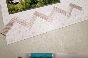 - Use the wood grain designer paper, cut two 1.5” x 12” strips, then cut each strip into ½” x 1.5” strips to create a wood plank look.