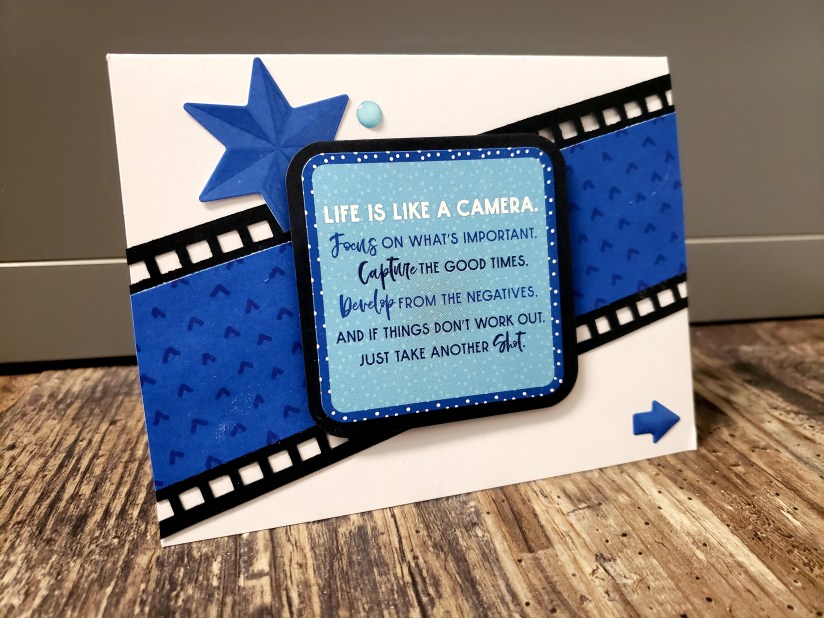 I’m popping in to share the card I made for the Creative Memories Virtual Card Crop #7 and thought you’d like to see how I made the filmstrip border – so fun, you might even want to use on your album pages!