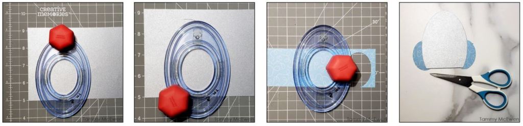 - From light blue Designer Paper, cut two ovals using the second smallest CCS Oval Pattern, inside track with the red blade.