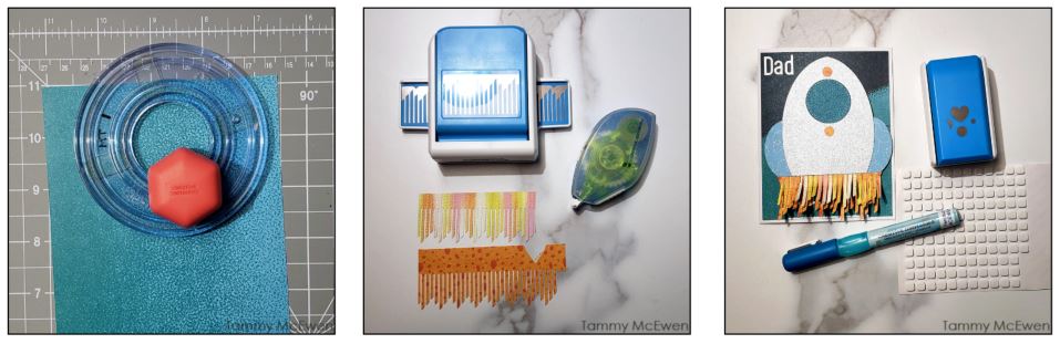 - Use the Fringe Border Punch to punch two 4″ borders from different coloured Designer Paper (or use Micro-Tip Scissors to carefully cut the fringe) Adhere in layers, trim excess.