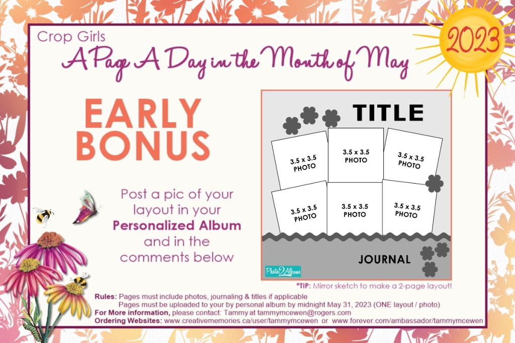This is a fun little 31-day Spring Challenge for you to retreat into your crop space and enjoy some time with your album projects! This challenge will motivate, inspire and help you complete those pages you’ve wanted to – in a fun online environment with your scrappy friends!
