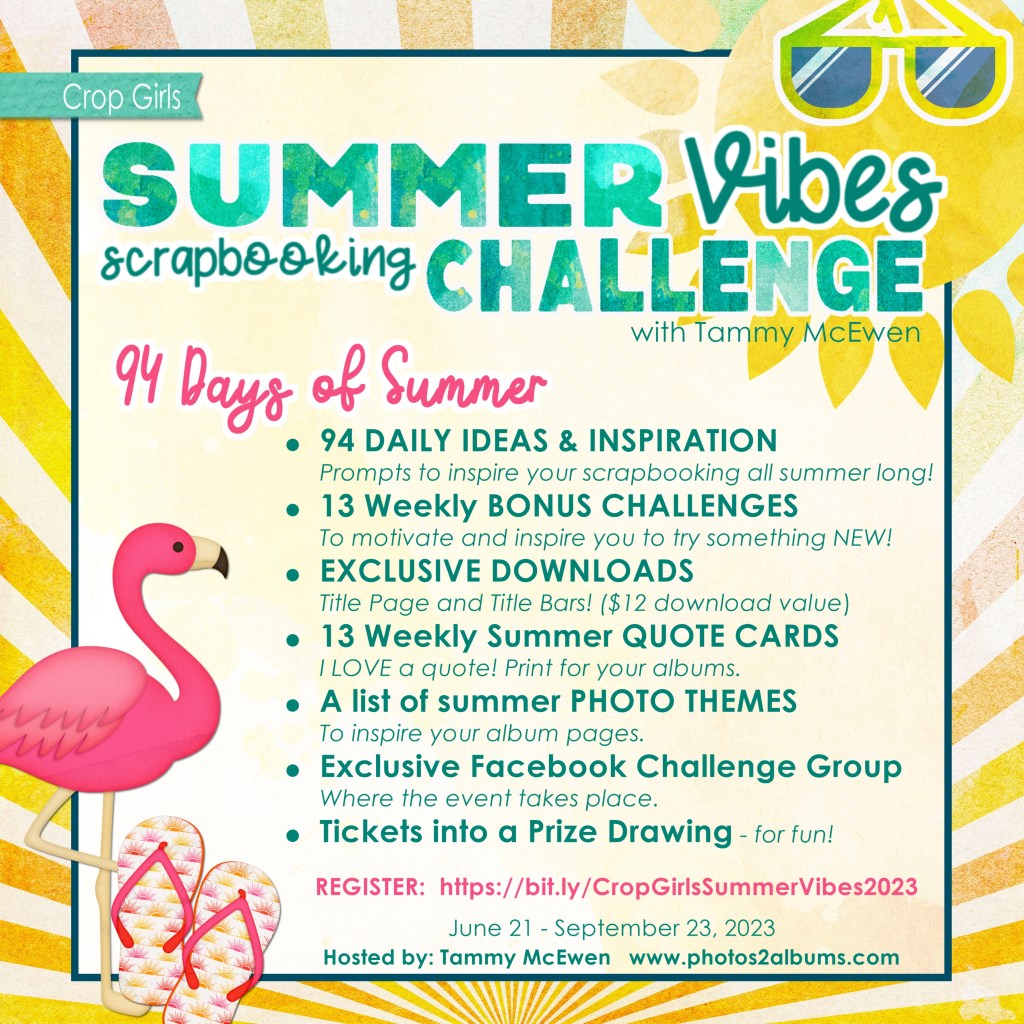 This challenge will motivate, inspire, and help you complete those pages you’ve been wanting to and/or to document Summer 2023 in a fun online environment with your scrappy friends! Click here for more details: https://bit.ly/CropGirlsSummerVibes2023