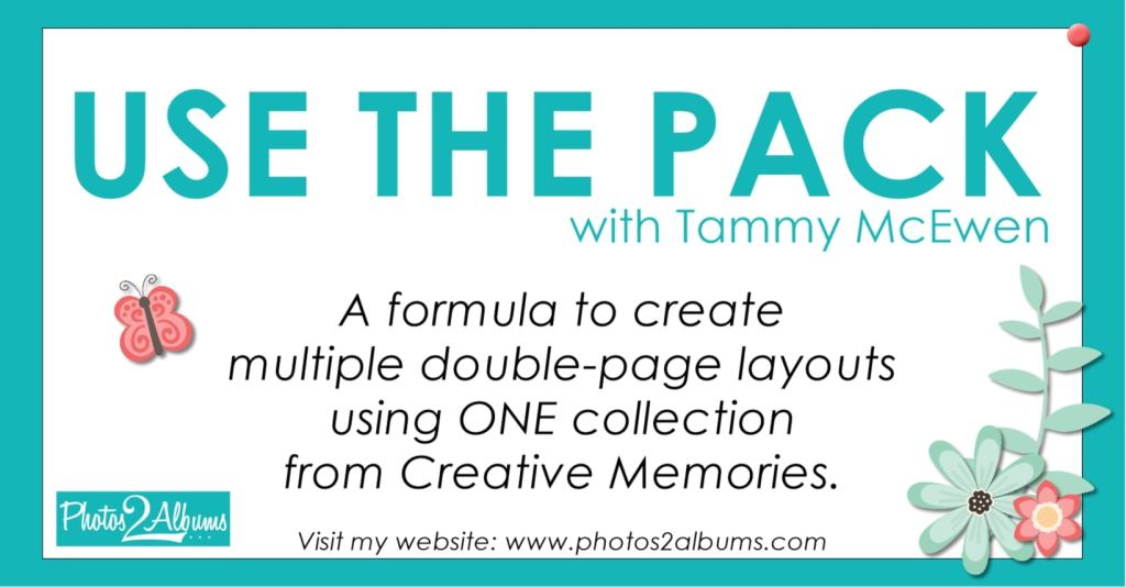 “Use the Pack” is a much-requested class featuring my formula to create multiple double-page layouts using all the components from one Creative Memories scrapbooking collection. It is perfect for adding to a themed or everyday album. Use this formula over and over with different collections!